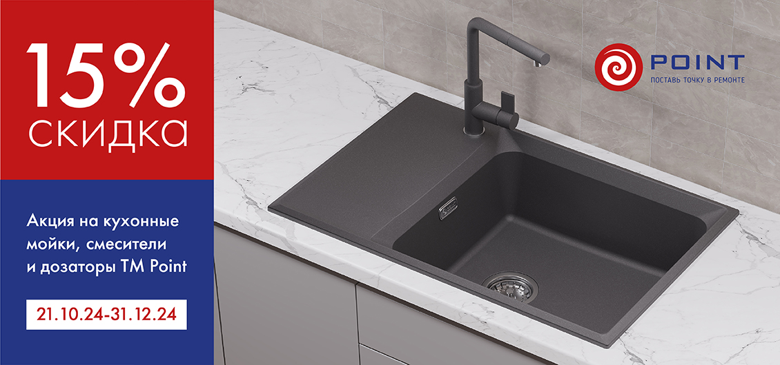 Акция POINT –15% на кухонные мойки, смесители и дозаторы с 21.10.2024 по 31.12.2024