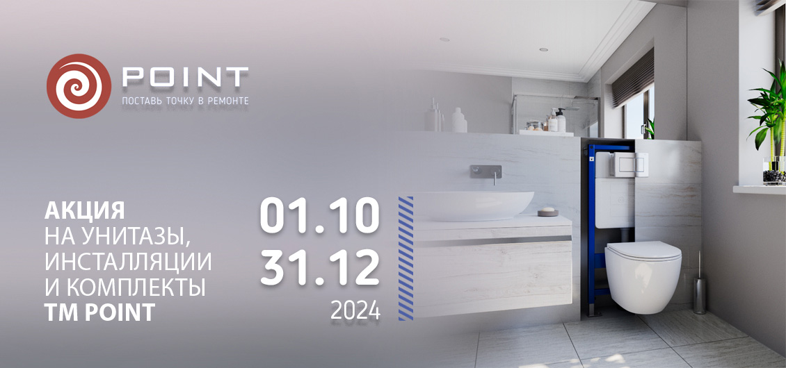 С целью поддержания наших продаж и продаж наших клиентов, мы продлеваем акцию на унитазы и инсталляции ТМ POINT на период с 01.08.2024 по 30.09.2024. Акция продлена на период с 01.10.2024 по 31.12.2024.