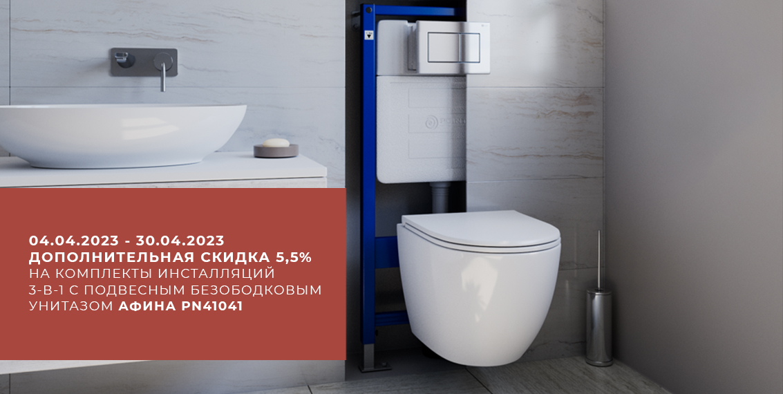 Дополнительная выгода 5,5% при покупке комплектов инсталляции 3-в-1 с унитазом Афина с 4 по 30 апреля 2023 г.
