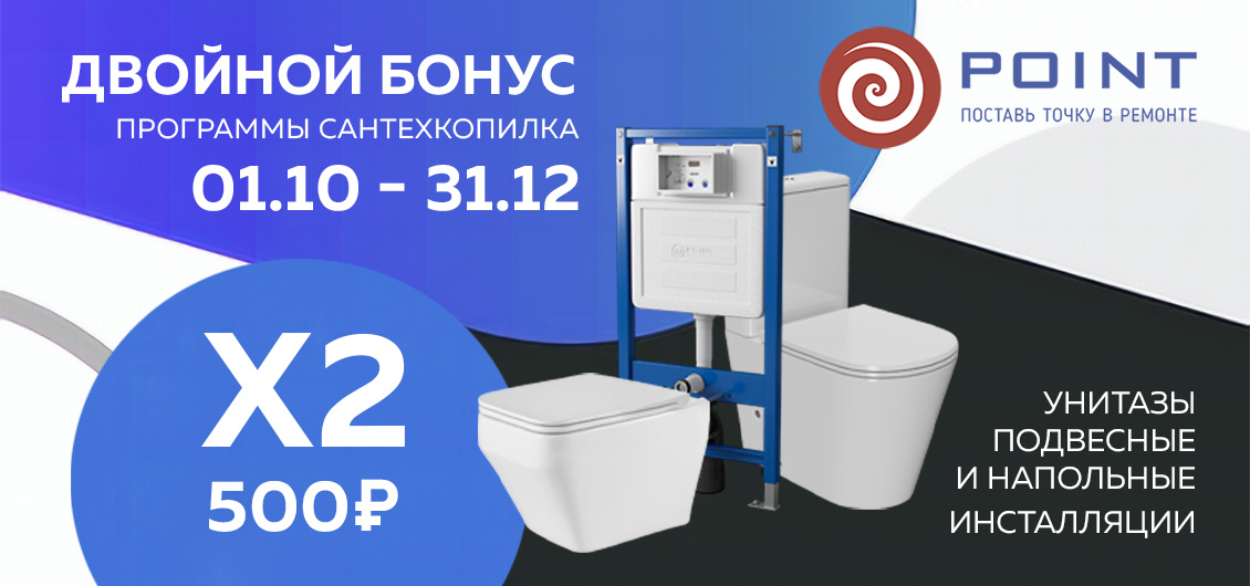 В период с 1 сентября по 31 декабря 2023 года продавайте любые унитазы и системы инсталляции Point и получайте удвоенные бонусы